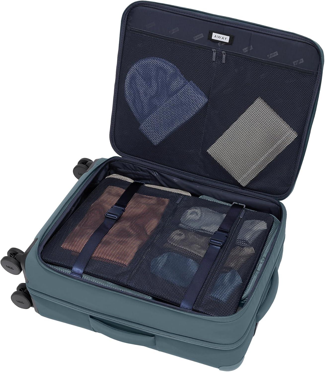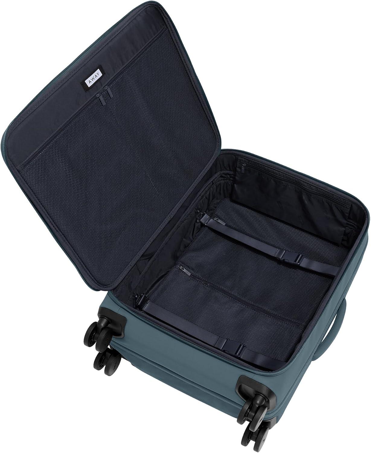 Spacious interior organization: One main compartment featuring our patented interior compression system and front lid storage to help you pack more in for 1-2 weeks, including a laundry bag. Internal dimensions: 21.3″ x 18.1″